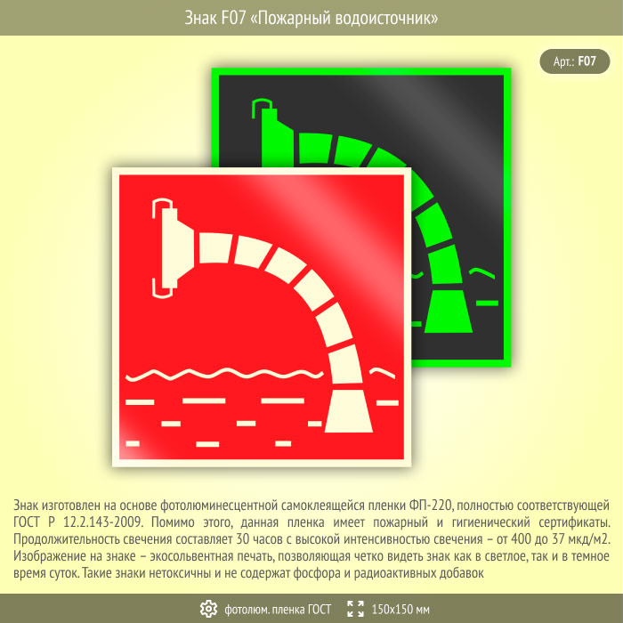 Знак F07 «Пожарный водоисточник» (фотолюминесцентная пленка ГОСТ 34428-2018, 150х150 мм) в Волгограде купить