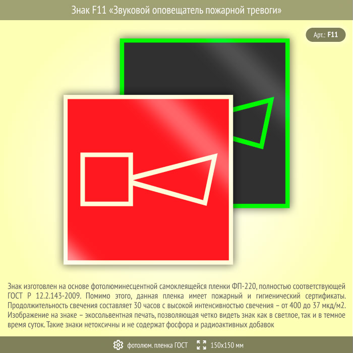 Знак F11 «Звуковой оповещатель пожарной тревоги» (фотолюминесцентная пленка ГОСТ 34428-2018, 150х150 мм) в Волгограде купить