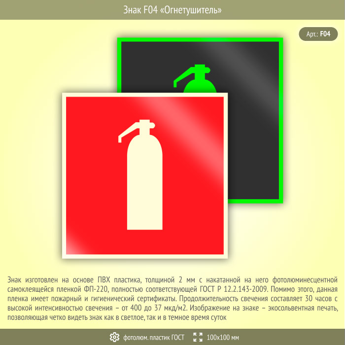 Знак F04 «Огнетушитель» (фотолюминесцентный пластик ГОСТ 34428-2018, 100х100 мм) в Волгограде купить