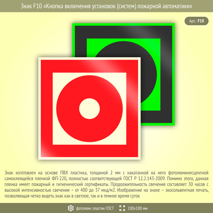 Знак F10 «Кнопка включения установок (систем) пожарной автоматики» (фотолюминесцентный пластик ГОСТ 34428-2018, 100х100 мм) в Волгограде купить