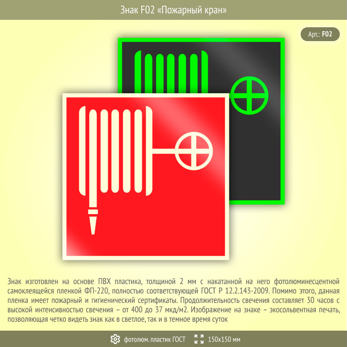 Знак F02 «Пожарный кран» (фотолюминесцентный пластик ГОСТ 34428-2018, 150х150 мм) в Волгограде купить