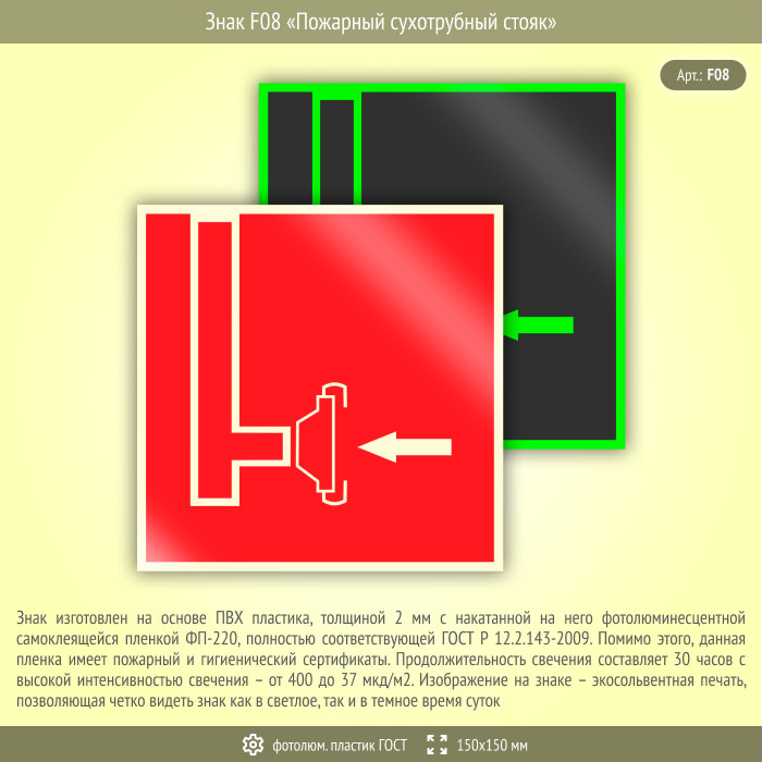 Знак F08 «Пожарный сухотрубный стояк» (фотолюминесцентный пластик ГОСТ 34428-2018, 150х150 мм) в Волгограде купить