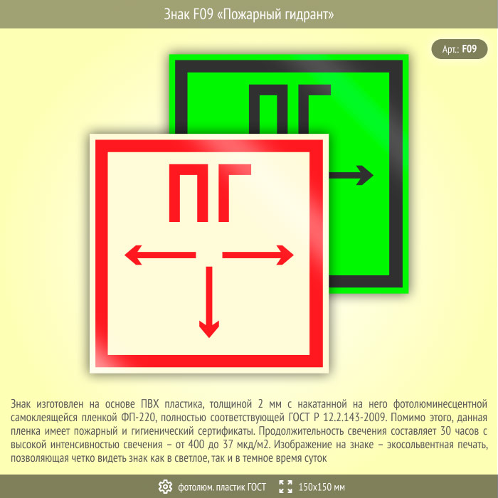 Знак F09 «Пожарный гидрант» (фотолюминесцентный пластик ГОСТ 34428-2018, 150х150 мм) в Волгограде купить