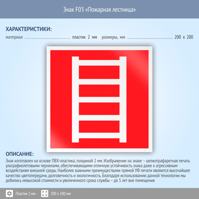 Знак F03 «Пожарная лестница» (пластик, 200х200 мм) в Волгограде купить
