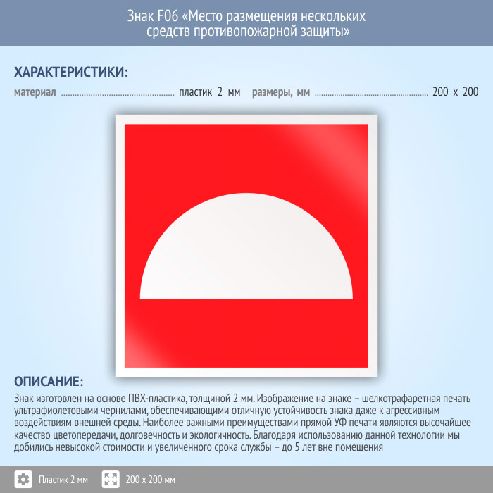 Знак F06 «Место размещения нескольких средств противопожарной защиты» (пластик, 200х200 мм) в Волгограде купить