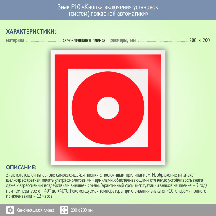 Знак F10 «Кнопка включения установок (систем) пожарной автоматики» (пленка, 200х200 мм) в Волгограде купить