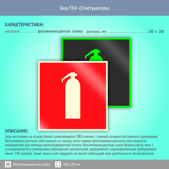 Знак F04 «Огнетушитель» (фотолюминесцентная пленка, 200х200 мм) в Волгограде купить