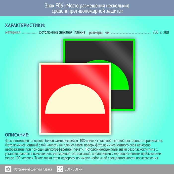 Знак F06 «Место размещения нескольких средств противопожарной защиты» (фотолюминесцентная пленка, 200х200 мм) в Волгограде купить