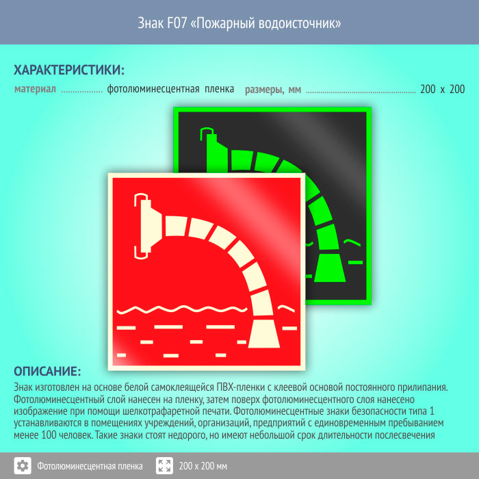 Знак F07 «Пожарный водоисточник» (фотолюминесцентная пленка, 200х200 мм) в Волгограде купить
