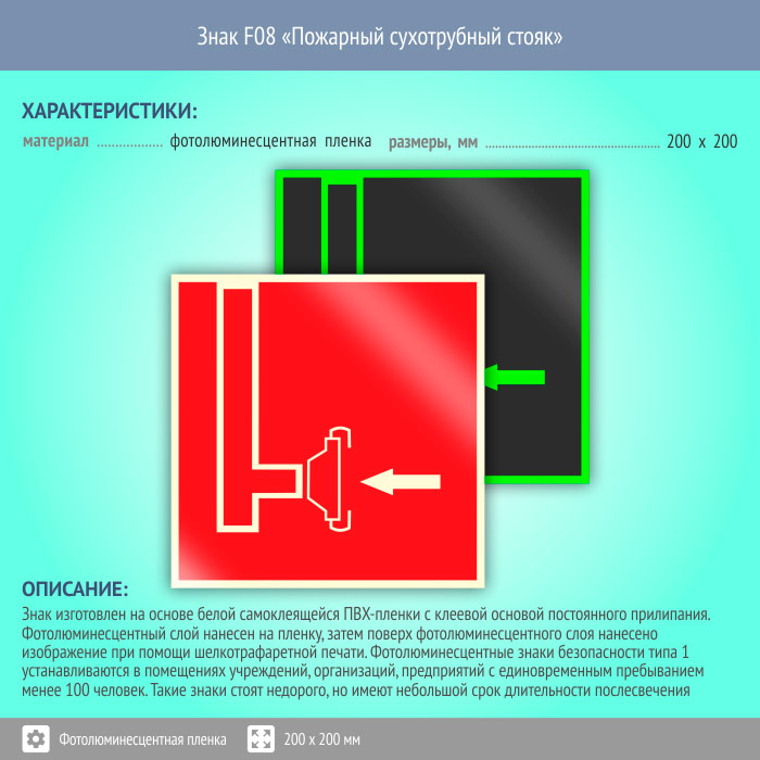 Знак F08 «Пожарный сухотрубный стояк» (фотолюминесцентная пленка, 200х200 мм) в Волгограде купить