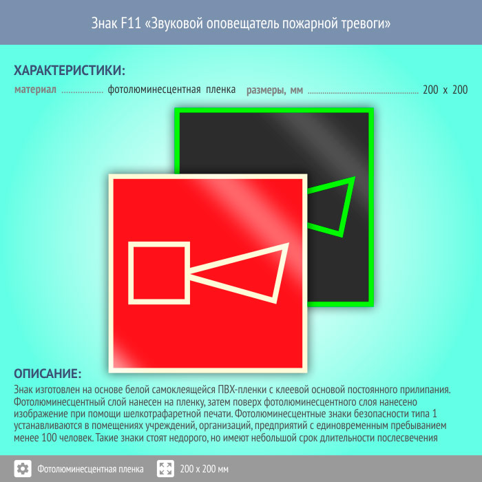 Знак F11 «Звуковой оповещатель пожарной тревоги» (фотолюминесцентная пленка, 200х200 мм) в Волгограде купить