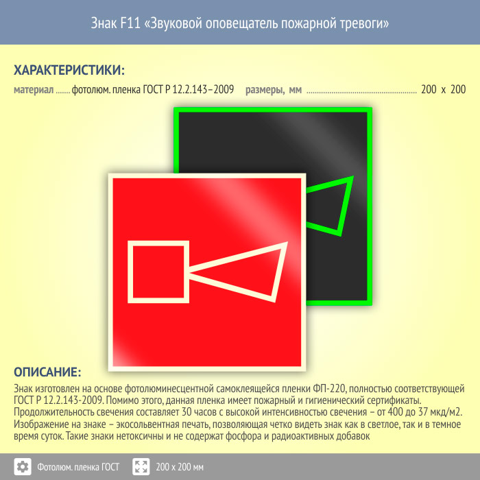 Знак F11 «Звуковой оповещатель пожарной тревоги» (фотолюминесцентная пленка ГОСТ 34428-2018, 200х200 мм) в Волгограде купить