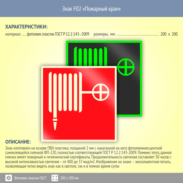 Знак F02 «Пожарный кран» (фотолюминесцентный пластик ГОСТ 34428-2018, 200х200 мм) в Волгограде купить