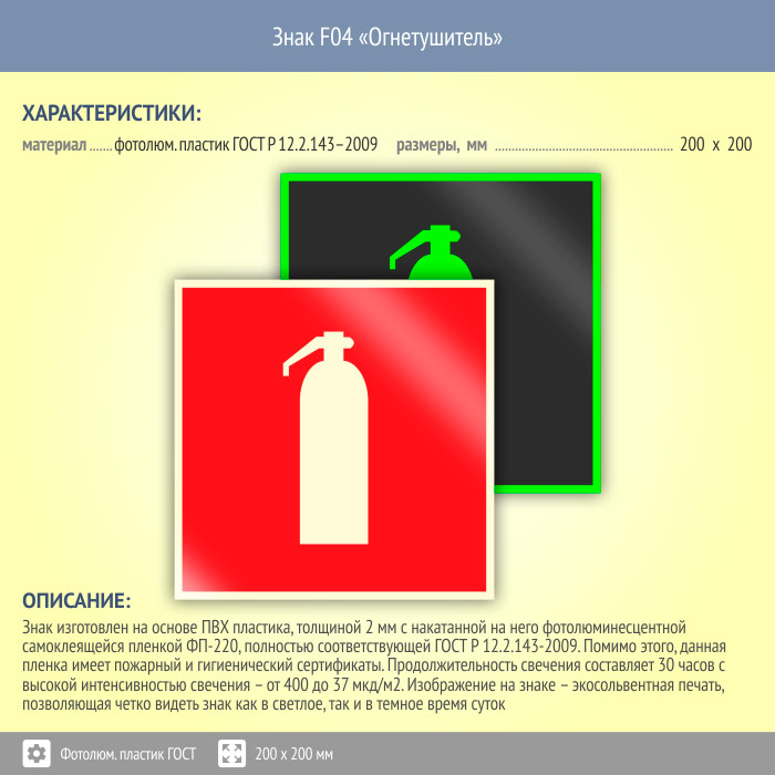 Знак F04 «Огнетушитель» (фотолюминесцентный пластик ГОСТ 34428-2018, 200х200 мм) в Волгограде купить