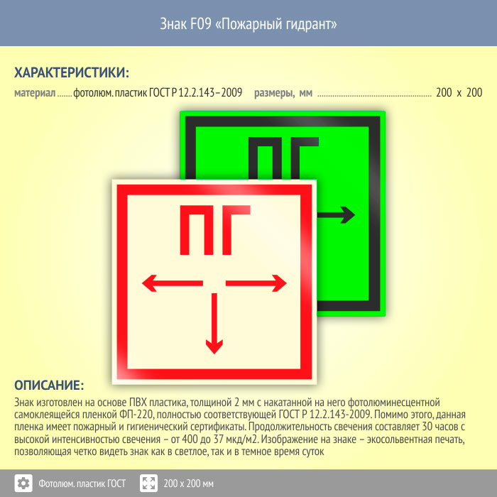 Знак F09 «Пожарный гидрант» (фотолюминесцентный пластик ГОСТ 34428-2018, 200х200 мм) в Волгограде купить