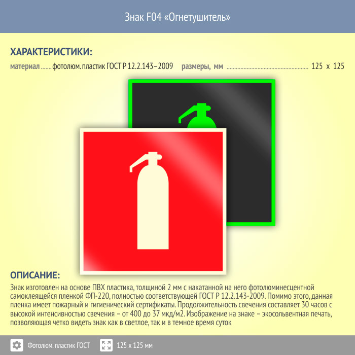 Знак F04 «Огнетушитель» (фотолюминесцентный пластик ГОСТ 34428-2018, 125х125 мм) в Волгограде купить