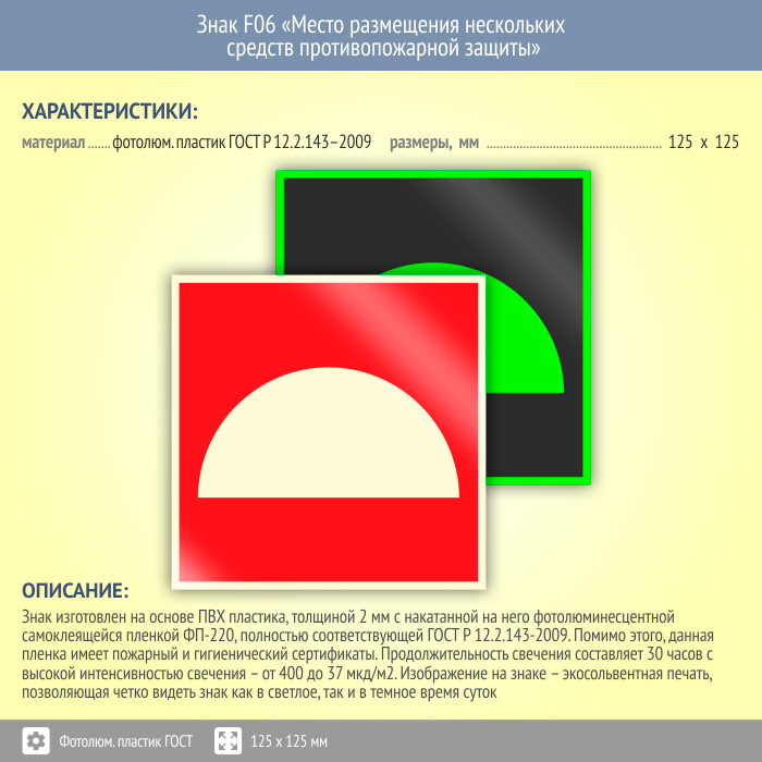 Знак F06 «Место размещения нескольких средств противопожарной защиты» (фотолюминесцентный пластик ГОСТ 34428-2018, 125х125 мм) в Волгограде купить