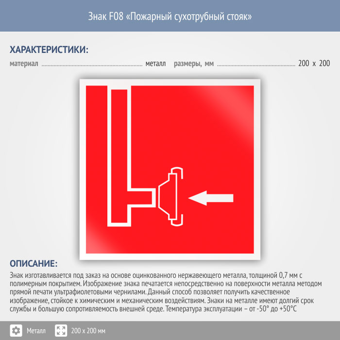 Знак F08 «Пожарный сухотрубный стояк» (металл, 200х200 мм) в Волгограде купить