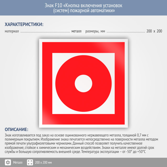 Знак F10 «Кнопка включения установок (систем) пожарной автоматики» (металл, 200х200 мм) в Волгограде купить